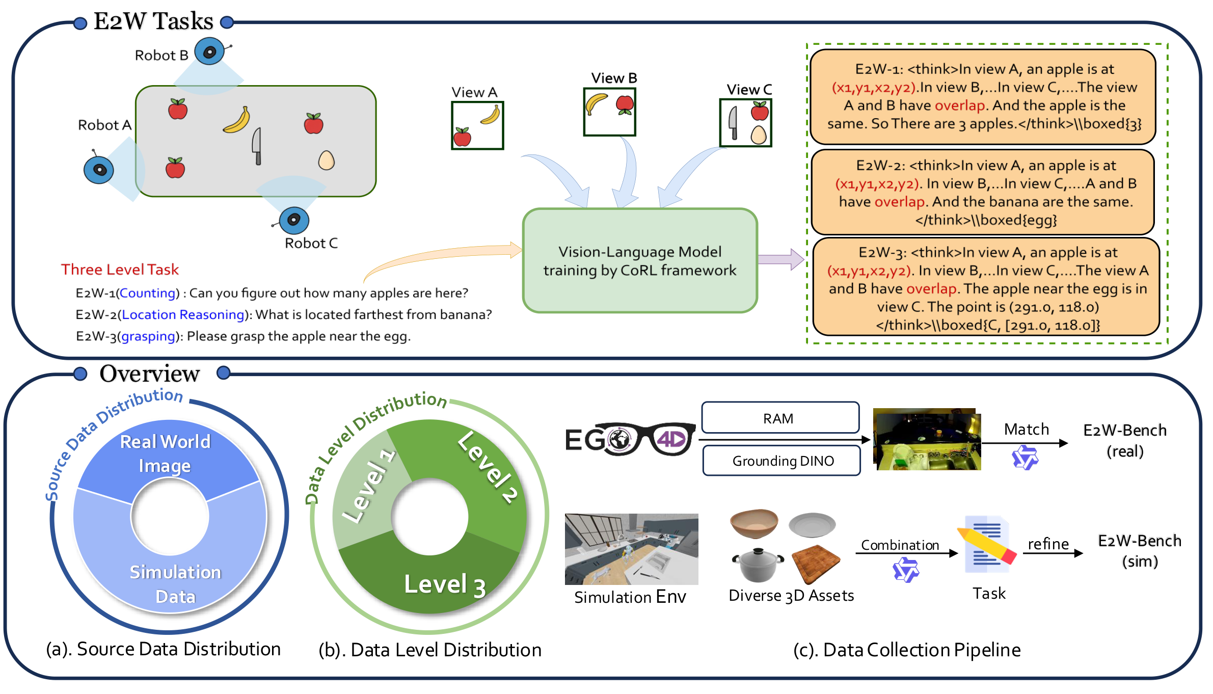 Figure 3. E2W-Bench overview. Three-level tasks with data collected from simulation environments (diverse 3D assets) and real-world robot setups (annotated via RAM + Grounding DINO).