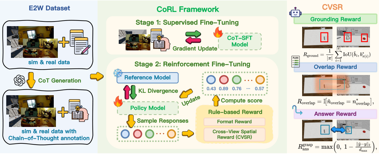 Figure 2. CoRL Framework. Stage 1: SFT with Chain-of-Thought supervision on sim & real data. Stage 2: Reinforcement fine-tuning with Cross-View Spatial Reward (CVSR) — comprising grounding reward (bbox IoU), overlap reward (cross-view entity matching), and answer reward (task-specific accuracy).
